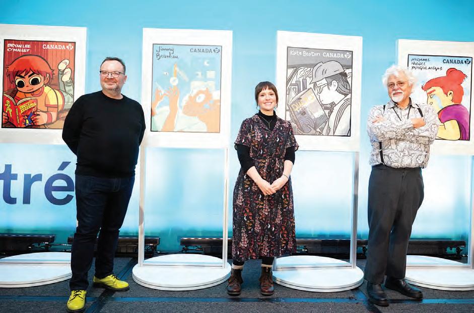 Bowenartistandauthor Michael Nicoll Yahgulanaas wasoneofsixartists recognized by Canada Post last weekwith their ownstampdesign to celebrate the graphicnovelgenre. For his design Yahgulanaas(right) -seen here alongsideJimmy Beaulieu(left) andJulie Doucet(middle) at the stampunveiling in Montreal-chose to blend Asianbrush techniques with North Pacific Indigenous iconography inhomage to his2009 graphic novel‘Red:AHaida Manga’. Also recognized were Kate Beaton,Guy DelisleandBryan Lee O’Malley./ Canada Postphotos