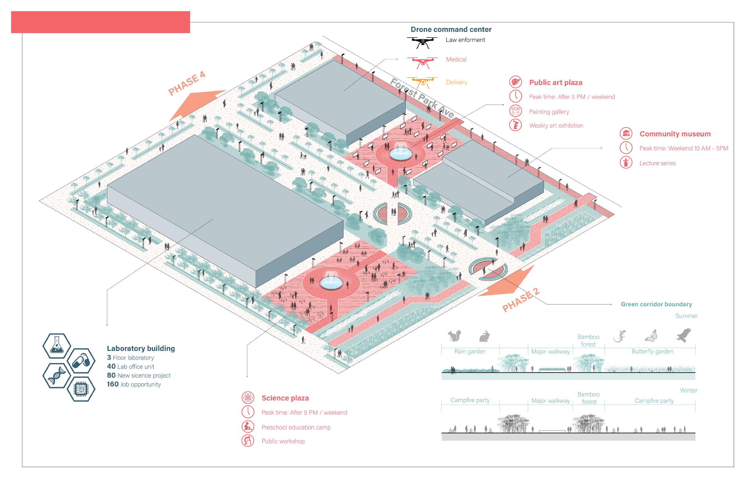 The visitor center will serve as a place to hold conferences and local social events. The port will serve as a transportation choies for local residents on a daily base. The plaza will serve as a place for having outsie movie night or concert for local artists.