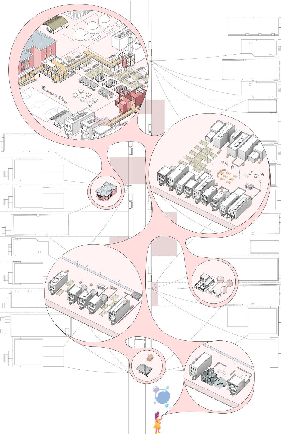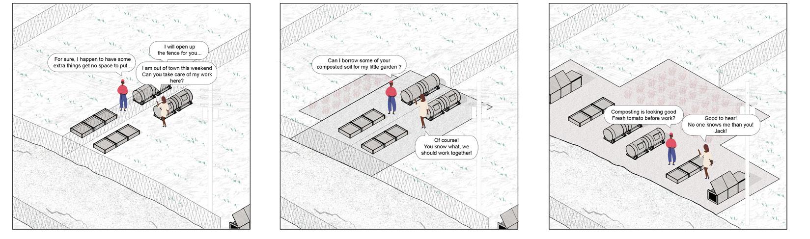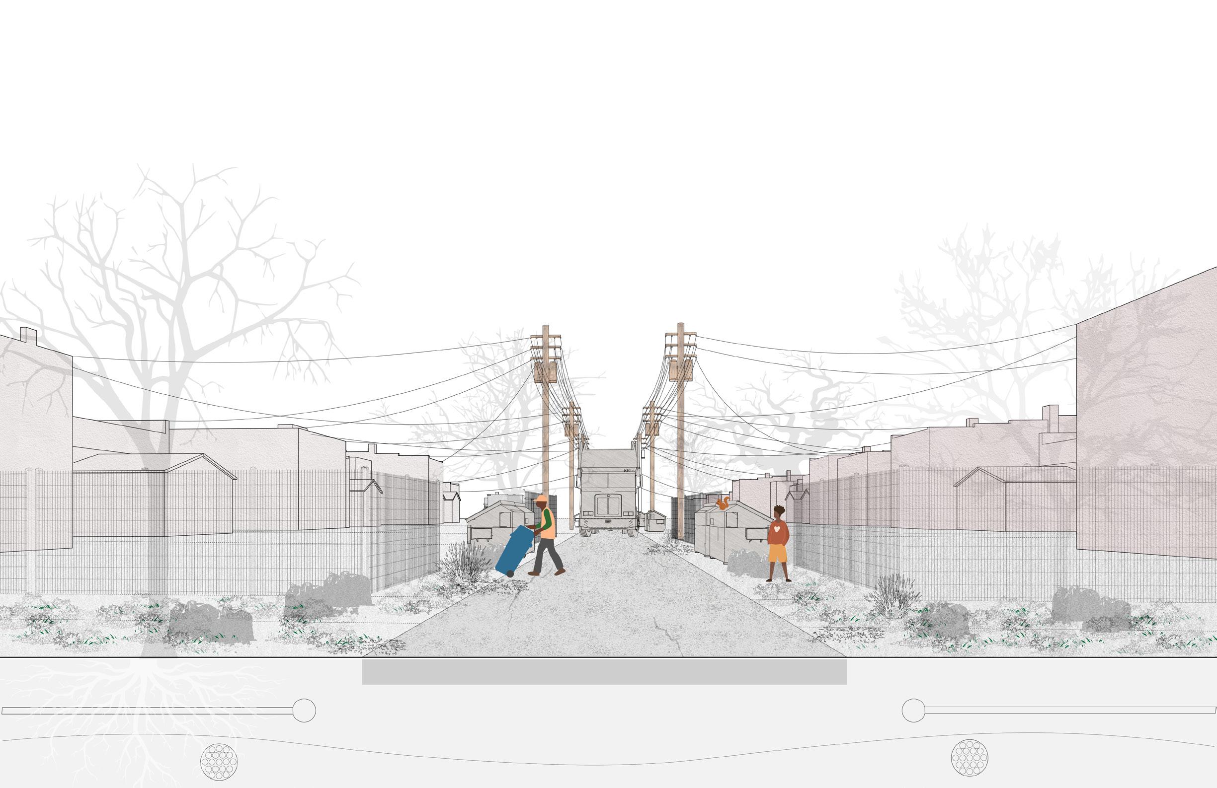 Learning from the success of black wall street and using it as a trigger, we are trying to reconfigure the possible future of the fountain park community. As vulnerable the current system is, whether it is waste treatment, food production or energy generation, we are testing different possibilities through different scenarios with the idea of reshaping the system into a self-sustain and productive one which will help to strengthen the community from within to withstand the outside disturbances. From reforming waste treatment system to community-wide food and energy production system on different scales, the community will have the possibility to support itself. Give them a chance to create a community that is built by its people, for its people. As time goes by and the community are well fit in these strategies, the self-sustainable resource recycle system will help them get rid of traditional municipal services, such as electricity input and trash pick-up, which gives opportunities for new spatial configuration, the alley along backyards disappears and backyards could combine with each other to induce shared ownership of open space inside the neighborhood, as well as reutilizing the unoccupied school building for shared use as anchor of the community, which offer space for further development of the neighborhood under the context of climate change.