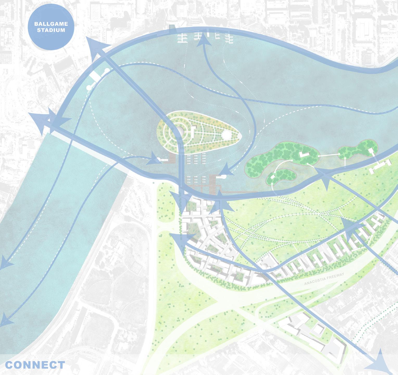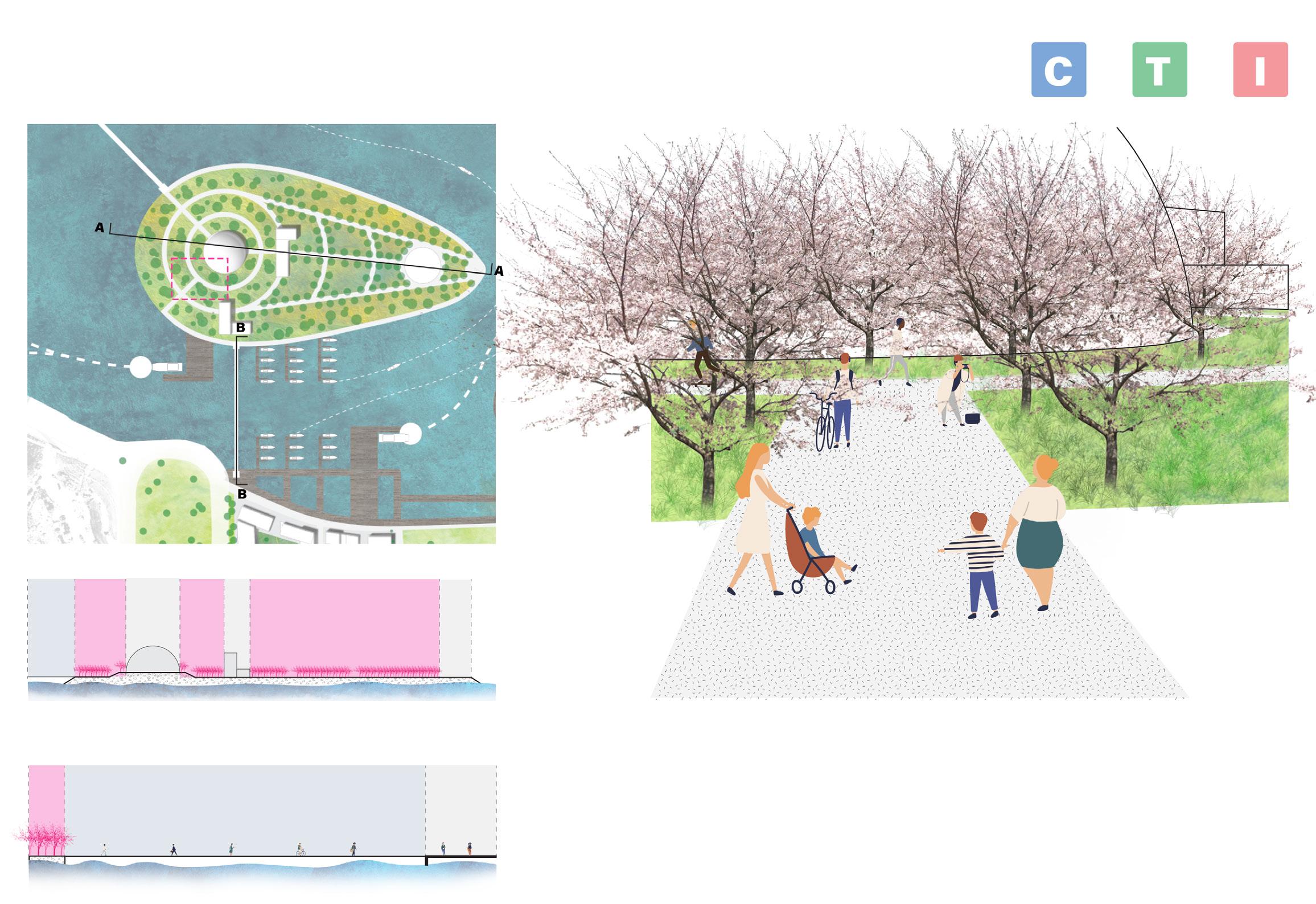 Cherry blossom will attact tourists and ball game watchers. Visitor center serves as a place for information and food. Beer & BBQ plaza will serve as a gathering place for game watchers. Water taxi port will serve as a recreational activitis for outsides.