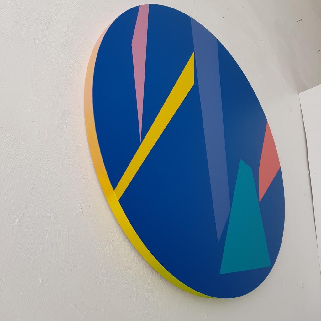 I am interested in the perception of shape and space – the boundaries and opacities of colour, line and edge and the subsequent effects when they meet or merge in real or projected space. Often use the circular tondo format as I like how it removes the weight of any physical corner of the picture support dictating a portrait or landscape format.