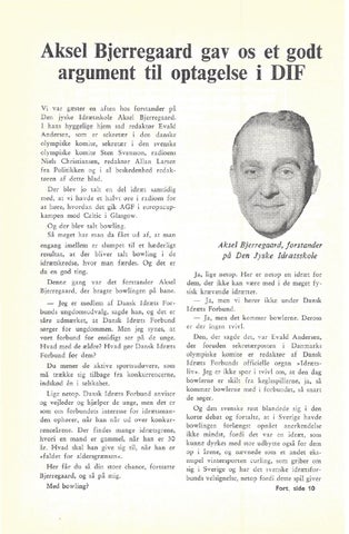 Aksel Bjerregaard, forstander på Den Jyske Idrætsskole Ja, lige netop. Her er netop en idræt for dem, der ikke kan være med i de meget fysisk krævende idrætter. - Ja, men vi hører ikke under Dansk Idræts Forbund. - Ja, men det kommer bowlerne. Derom er der ingen tvivl. Den, der sagde det, var Evald Andersen, der foruden sekretærposten i Danmarks olympiske komite er redaktør af Dansk Idræts Forbunds officielle organ »Ldrætsliv«. Jeg er ikke spor i tvivl om, at den dag bowlerne er skilt fra keglespillerrre, ja, så kommer bowlerne med i forbundet, så snart de søger. Og den svenske røst blandede sig i den korte debat og fortalte, at i Sverige havde bowlingen forlængst opnået anerkendelse ikke mindst, fordi det var en idræt, som kunne dyrkes med stor udbytte også for dem op i årene, og nævnede som et andet eksempel vintersporten curling, som griber om sig i Sverige og har det svenske idrætsforbunds velsignelse, netop fordi dette spil giver Fort. side 10