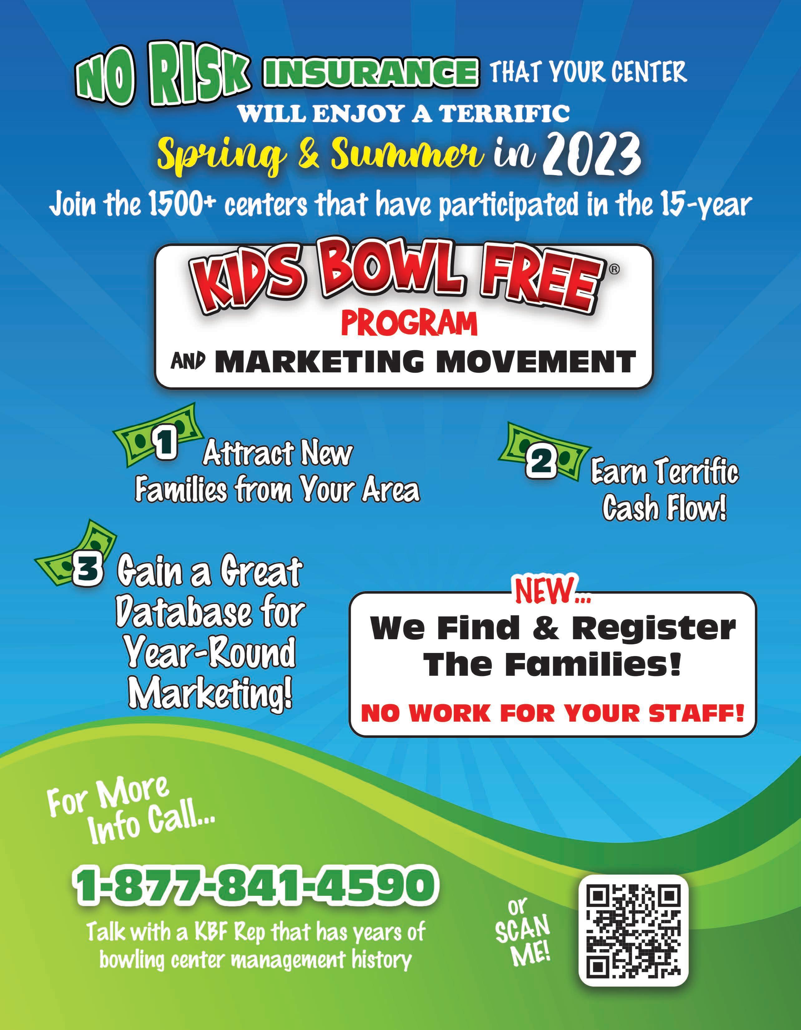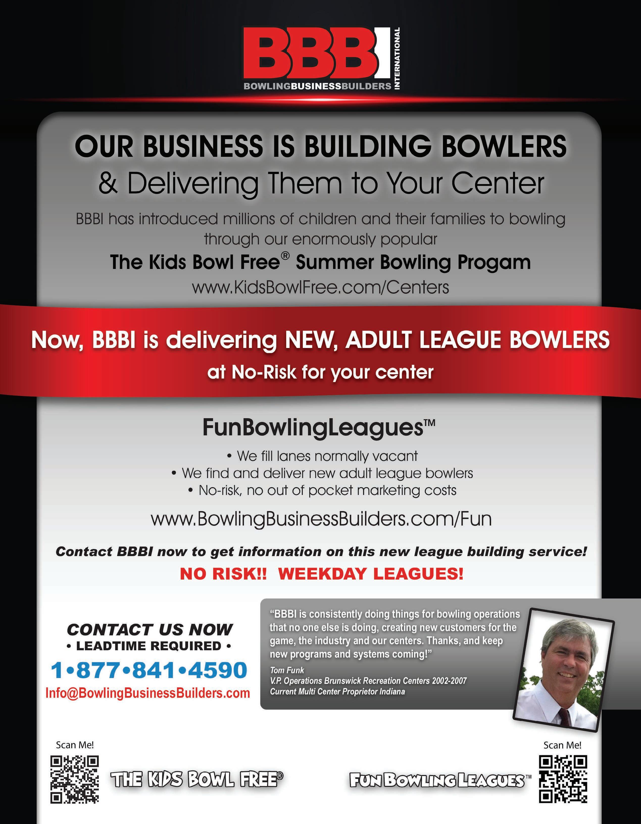 At BBBI our goal is to create new customers and profits for bowling centers through our time tested Kids Bowl Free Summer Bowing Program and our new League Development System featuring Fun Bowling Leagues for all ages.