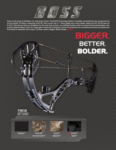 Gone are the days of limitations for long draw archers. PowerShift Technology delivers versatility unmatched by any compound bow on the market. The Boss, measuring a full 36” axle to axle, has a 7” brace height and a draw length range from 26” all the way out to 31.5”. Not only are there no limitations for the long draw archers, we outfitted the Boss with our award winning technologies such as the OverDrive Binary Cams for impeccable tuning and consistency, Center Pivot Extreme for unmatched accuracy and speed and FLX-Guard to eliminate riser torque. The Boss really is Bigger, Better, Bolder. #BOSS