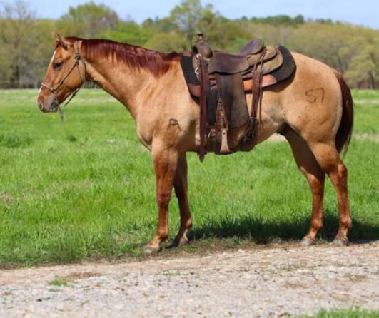 Hip # 8 Cash Remind Aces is a yearling red dun gelding by Cs Cash Remind and out of Tee Full Of Aces. CS Cash Remind is one of our reference sires from the CS Ranch who is the grandson of Letters Reminder he is by Docs J Jay a NCHA money earner and 13 AQHA points. Sire of 79 RGP money earners, 66 AQHA point earners. This gelding checks all the boxes- color, confirmation, and pedigree. He would excel in roping, or ranch working. Take him home train him and put him to work! Ranching Heritage Eligible.