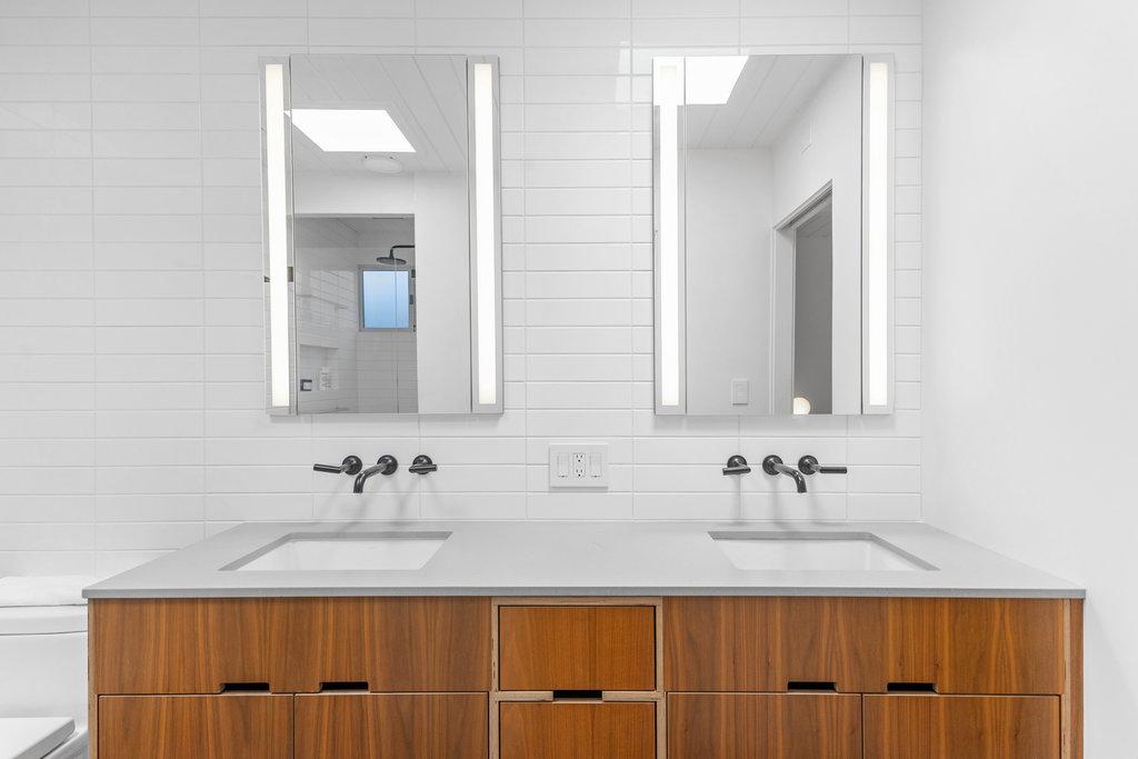 The great room exudes elegance with its 10-foot ceilings, transom windows, and a striking fireplace flanked by floor-to-ceiling glass. The dining area, highlighted by a George Nelson lamp, offers a sophisticated space for entertaining. The primary suite is a sanctuary of luxury, featuring a custom dual-sink vanity, designer backlit mirror, skylight, hex tile flooring, and a beautiful plank-tiled shower. The hall bath is equally impressive with a custom vanity, backlit mirrors, skylight, hexagonal tile flooring, and a tub/shower combination.