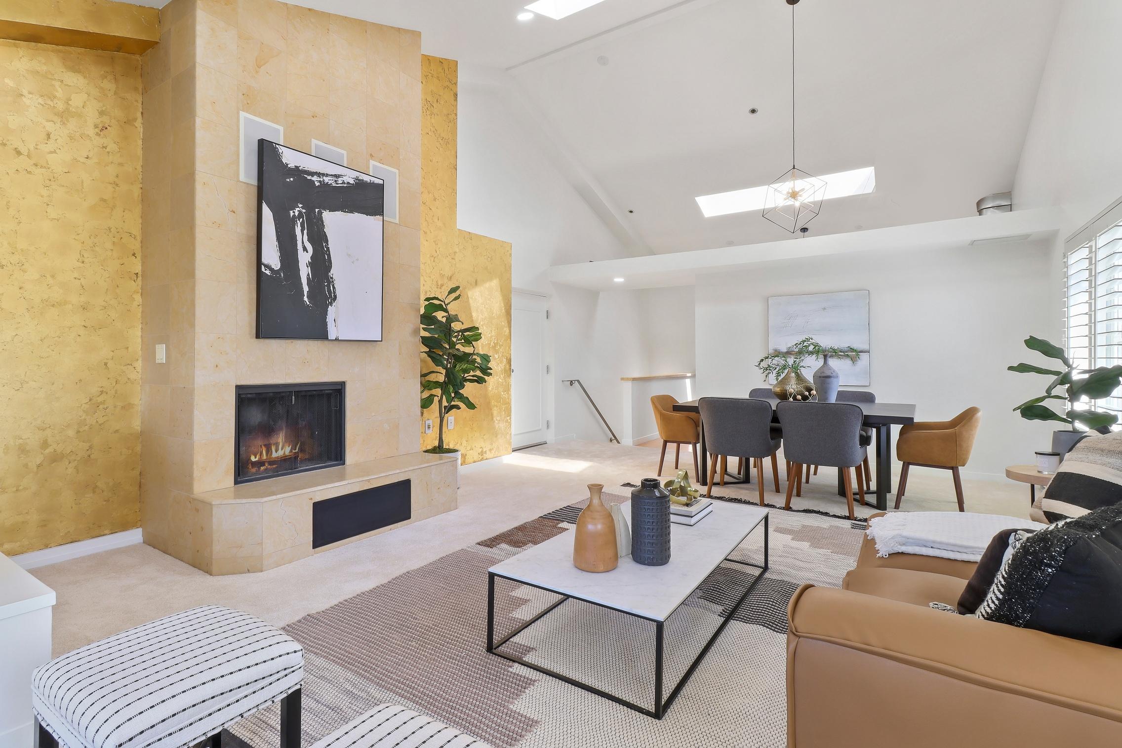Contemporary eat-in kitchen offering a designer Italian countertop, custom cabinetry, top of line stainless appliances, SubZero, Miele, and pendant lighting over the peninsula. Expansive living room features vaulted ceilings, recessed lighting, skylight, and gold leaf accent wall.