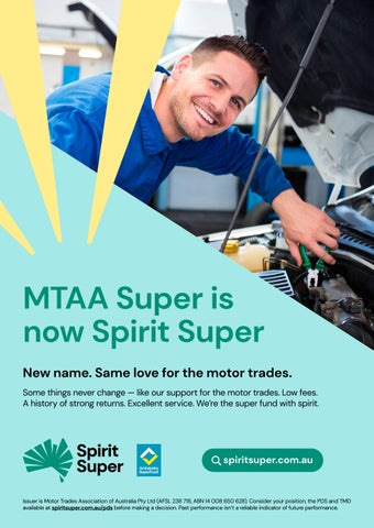 Spirit Super is the national industry-based super fund that has proudly served the motor trades and allied industries for over 25 years. We make administering super simple and efficient. It’s what makes us the preferred choice of over 40,000 employers. Call 1800 005 166 or visit spiritsuper.com.au/Employers/supportfor-your-business You should consider the PDS in making a decision.