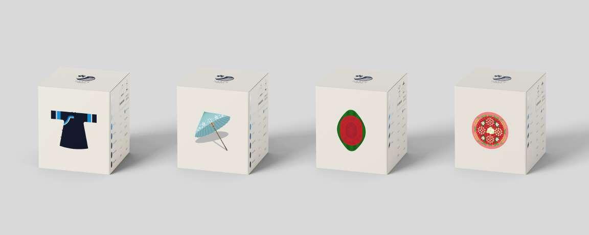 輔助色的選擇使用青藍色系為主,寓意為 最初的馬藍、大菁染料,其包含挑選的五 個輔助色,代表染色期間中的不同材質與 浸泡時間次數。
