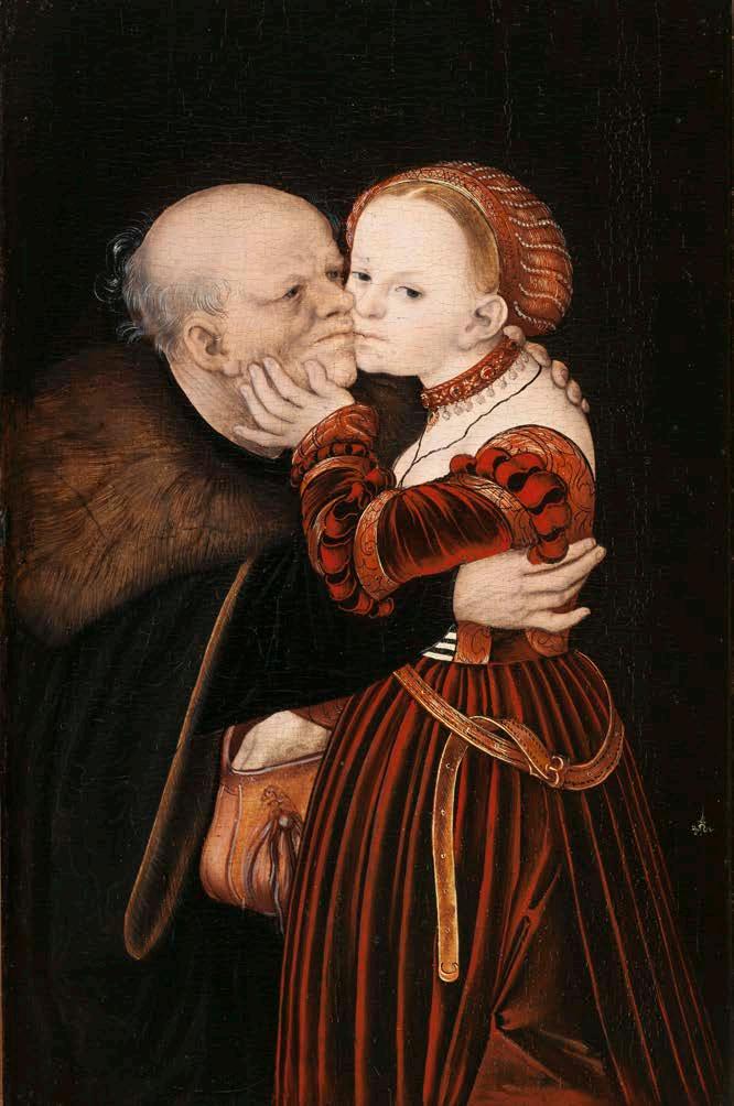 Ook jong en oud samen vormen een stel waarmee openlijk werd gelachen. Lucas Cranach de Oude schilderde een veertigtal ‘ongelijke liefdes’. Slechts drie keer koppelt hij een oude vrouw aan een jonge man. Een van die dubbelportretten (ca. 1520-1522) wist Bozar voor Bellezza e Bruttezza te strikken. Emanciperend is het dubbelportret geenszins bedoeld. Doorgaans tast de jonge vrouw naar de geldbeugel van een bejaarde man. Hier neemt de oudere vrouw het initiatief en steekt ze een jongeman grijnzend haar geld toe. In het gapende gat van haar mond priemen nog drie tanden. Cranach spot met de seksuele lust van de vrouw en waarschuwt het jonge blaadje.