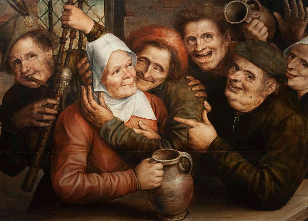 Moraliserende en satirische taferelen koppelden het lelijke aan de hoofdzonden, waaronder hoogmoed, hebzucht, gulzigheid en onkuisheid. Naast de lagere klassen moesten ook ouderen het ontgelden. Alles had zijn tijd, vond men. De liefde bedrijven op hoge leeftijd hoorde niet langer. Het werd als onnatuurlijk en zelfs schadelijk beschouwd. In Het vrolijke gezelschap (1562) beeldt Jan Massys een ouder verliefd koppeltje af in een taveerne. Massys maakt zich via het gezelschap vrolijk over het stel. Een muzikant bespeelt een halflege doedelzak, een belabberd fallussymbool. De oude vrouw houdt een kruik vast, symbool van het vrouwelijk geslacht. Achter haar geeft een grijnzende figuur spottend commentaar. Hij toont ons een lege kruik.