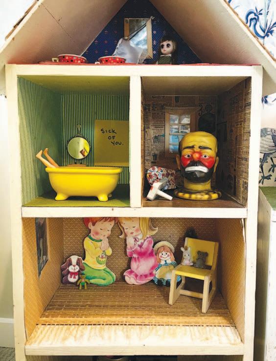 Barbie may have her dreamhouse, but Roberts calls her house “Becky’s Nightmare House.” Like many artists, she uses its scenes, and her assemblage art in general, to explore an internal world. While her husband can sometimes pinpoint the situations or emotions behind each piece, most are left to the interpretation of the viewer. Perception is personal.