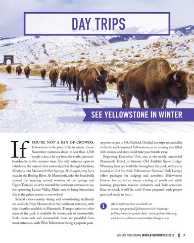 More information available at www.nps.gov/yell/planyourvisit/-visitingyellowstone-in-winter.htm, www.yelowstone.org, and www.yellostonenationalparklodges.com
