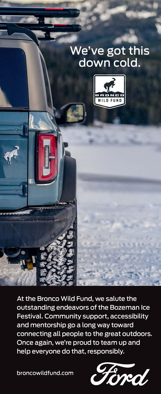 to your 26th annual Bozeman Ice Festival! We’re exited to see friends both old and new join us in Bozeman as we celebrate, commisserate and most importantly—climb, together. Right from the start, we’d like to thank and acknowledge all the sponsors, participants, staff, volunteers, and community members who have consistently shown up and thrown down to make this event happenv. As we continue to evolve and grow, we need you all more than ever, and we’re looking forward to a great week of being connected here in Bozeman.