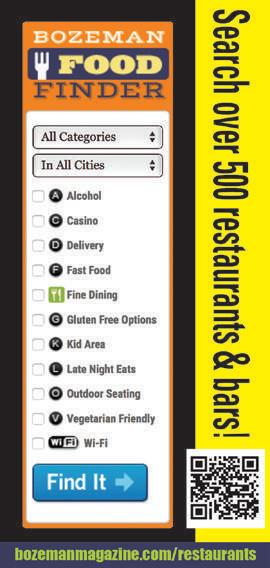 We’ve done our best to include all restaurants in our area. If we missed yours, or if you have a new restaurant that you would like us to include on our website and in the next issue of Food Scene, email us at: info@bozemanmagazine.com or call: 406 219-3455.