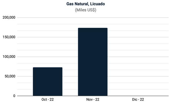 Las exportaciones peruanas en el cuarto trimestre del 2022 sumaron un valor FOB de US$ 12,421 millones, siendo éstas inferiores a las del cuarto trimestre del 2021 en 56.8%. No obstante las cifras de exportación del país han sido impulsadas por productos como el gas natural licuado, siendo el Reino Unido el principal mercado.