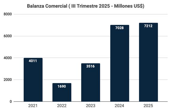 Según proyecciones de la Cámara de Comercio Peruano Británica y data disponible del Banco Central de Reserva del Perú (BCRP), la balanza comercial en el tercer trimestre del 2025 registraría un superávit de US$ 7,212 millones, representando un aumento de US$ 184 mil en comparación con el monto registrado en el mismo periodo del año 2024