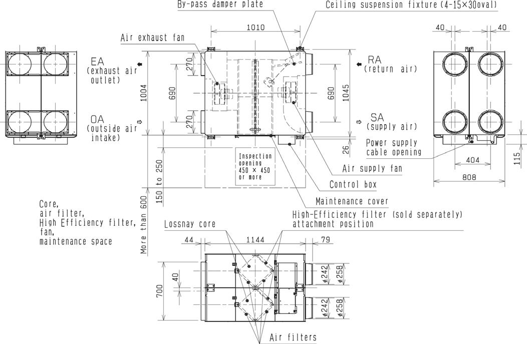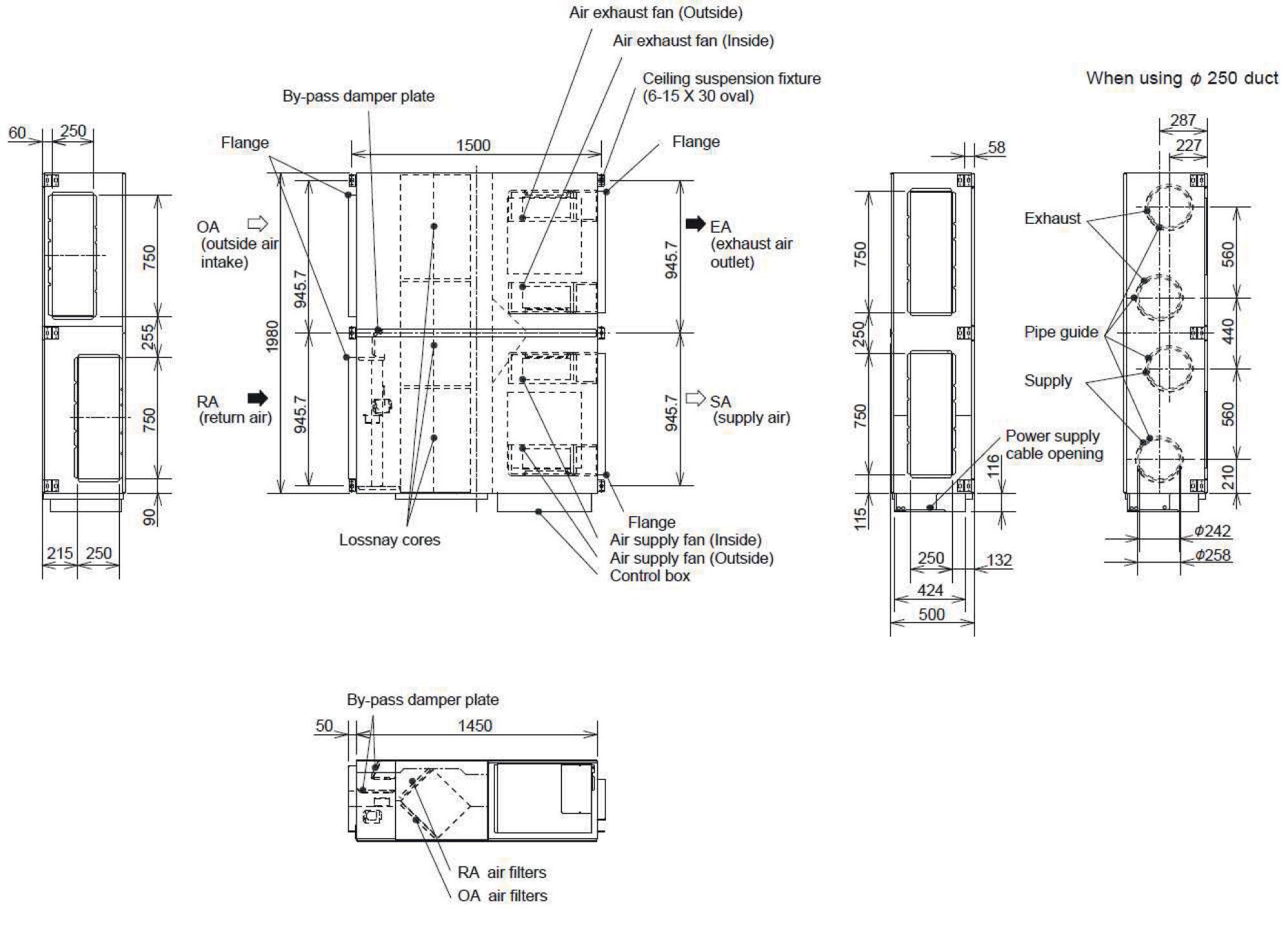 Electrical Power Supply Running Current (A) SP1 SP2 SP3 SP4 Input Power (W) SP1 SP2 SP3 SP4 Airflow (m3/h)*² SP1 SP2 SP3 SP4 Airflow (l/s)*² SP1 SP2 SP3 SP4 Specific Fan power (W/(l/s)) SP1 SP2 SP3 SP4 External Static SP1 Pressure (Pa) SP2 SP3 SP4 Sound Pressure SP1 Level (dBA) SP2 SP3 SP4 Temperature SP1 Exchange SP2 Efficiency (%) SP3 SP4 Enthalpy Heating SP1 Exchange SP2 Efficiency (%) SP3 SP4 Cooling SP1 SP2 SP3 SP4 Weight (kg) Dimensions (mm) Width x Depth x Height Duct Size (mm) Standard Filter*1 Fuse Rating (BS88) – HRC (A) LGH-150RVXT-E 220-240V, 50Hz 0.36 1.10 2.40 4.30 48 176 421 792 375 750 1125 1500 104 208 313 417 0.46 0.85 1.35 1.90 11 44 98 175 22 29.5 35.5 39.5 81.5 81 80.5 80 75 73 71 70 74 72 70 69 156 1980 x 1500 x 500 250 x 750 EU-G3 10 LGH-200RVXT-E 220-240V, 50Hz 0.39 1.10 2.70 5.40 56 197 494 1000 500 1000 1500 2000 139 278 417 556 0.40 0.71 1.18 1.80 11 44 98 175 22 28 35.5 39.5 84 82.5 81 80 83 77 73.5 72.5 80.5 74.5 71 70 159 1980 x 1500 x 500 250 x 750 EU-G3 10 LGH-250RVXT-E 220-240V, 50Hz 0.57 1.40 3.60 7.60 82 244 687 1446 625 1250 1875 2500 174 347 521 694 0.47 0.70 1.32 2.08 11 44 98 175 24 32 39 43 82.5 80.5 79 77 79 74 71.5 68 76.5 71.5 69 65.5 198 1980 x 1500 x 500 250 x 750 EU-G3 10 Notes: Running Current, Input Power and Recovery Efficiency are based on the above airflow rate, power supply 240v, 50Hz. Sound Pressure Level measured at 1.5m under the centre of panel. *1: M6 medium efficiency filter and F8 high efficiency filter available as optional parts. *2: Airflow tested to Japan industrial standard JIS B 8628. SP1, SP2, SP3 & SP4 relate to the fan speeds of the Lossnay RVXT units i.e. fanspeed 1, 2, 3 & 4. MODEL Remote Controller Filters ePM10 75% / M6 filter ePM1 65% / F8 filter LGH-150RVXT-E ACCESSORIES LGH-200RVXT-E LGH-250RVXT-E PZ-62DR-EB PZ-M6RTFM-E PZ-F8RTFM-E