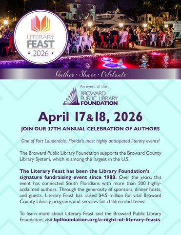 The weekend culminates with A Night of Literary Feasts, beginning with a Welcome Reception featuring an open bar, hors d’oeuvres, a silent auction, and book signings. At 7:30 p.m., guests depart to dine with one of the visiting authors at restaurants, clubs, or private homes throughout Fort Lauderdale. Sponsorship details are available at bplfoundation.org/a-night-of-literary-feasts. For more information, email info@bplfoundation.org or call 954-357-7382