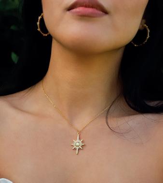 Our hero designs include our star-studded vegan leather Nova Handbag, north star Heidi Necklace with birthstone, Margot Sparkling Star Choker, Esmae Moon and Star Earrings, Juliet starburst Y-drop necklace and our Juno Hair Clip Set.