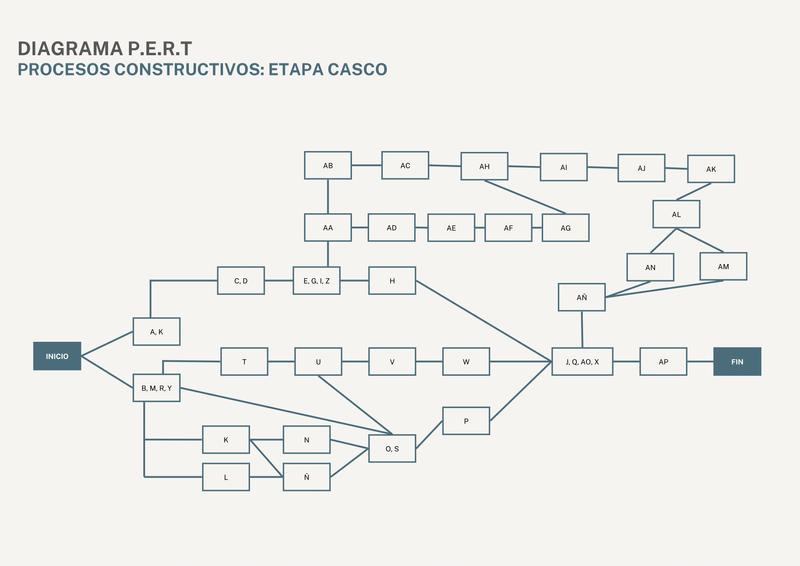 En esta segunda etapa de la primera evaluación continua, deberíamos de realizar un diagrama PERT de cada proceso visto en la secuencia de tareas de casco de obra. Además de presentar un diagrama completo que sea el conjunto de todas las actividades, sin contar los tiempos de duración de cada proceso.