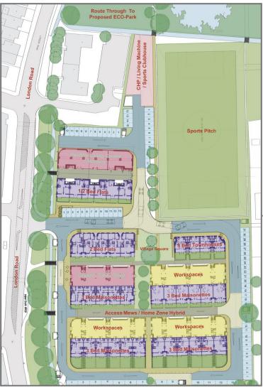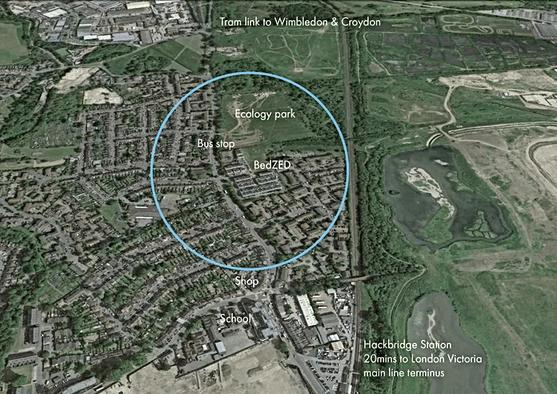 El proyecto comprende una superficie de 3000m² de suelo y se ubica en una zona residencial a 40 minutos al sur de Londres. Al hablar de proximidad nos referimos lo que el proyecto tiene a su alrededor y abastece pues es necesario tener ciertos lugares cercas para que funcione de mejor forma la edificación. De esta manera integra 82 viviendas con espacios de trabajo adosados, locales comerciales, un espacio de exhibiciones, una guardería, instalaciones deportivas y una unidad de cogeneración de biomasa.