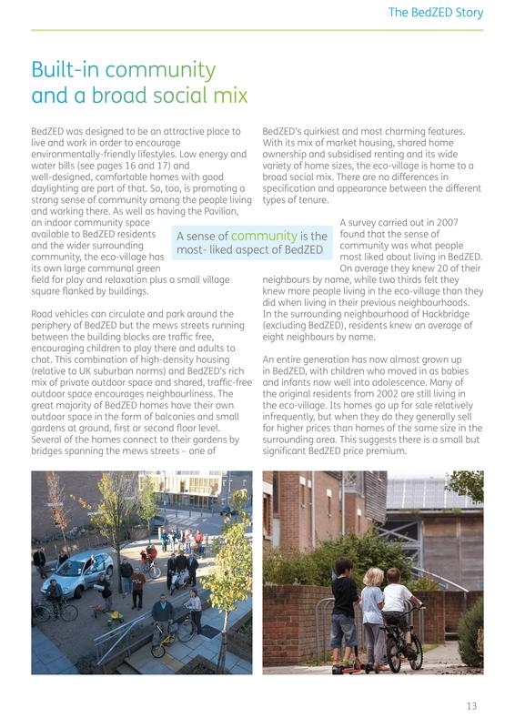 En el eco barrio BedZed está gestionada por el mismo estado, debido a que se dejó de cierta forma la dirección de esta ciudad al distrito local, pasando de una empresa privada a pasar a manos de Hackbridge, y por último al orden de Inglaterra. Creado por la Fundación Peabody para familias de bajos ingresos, y las unidades se vendieron a un precio igual al del mercado tradicional.