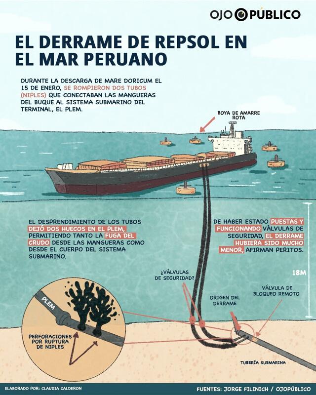que conllevó a la rápida propagación del derrame de petróleo en Ventanilla fue el desgarro de uno de los amarres de las boyas de seguridad del buque tanque MareDoricum.
