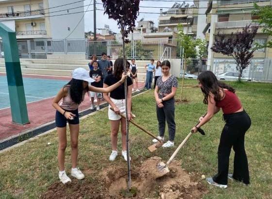 o Groups of students planted five new trees in the school yard. Then each group adopted a tree and chose a name for it.