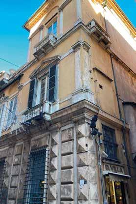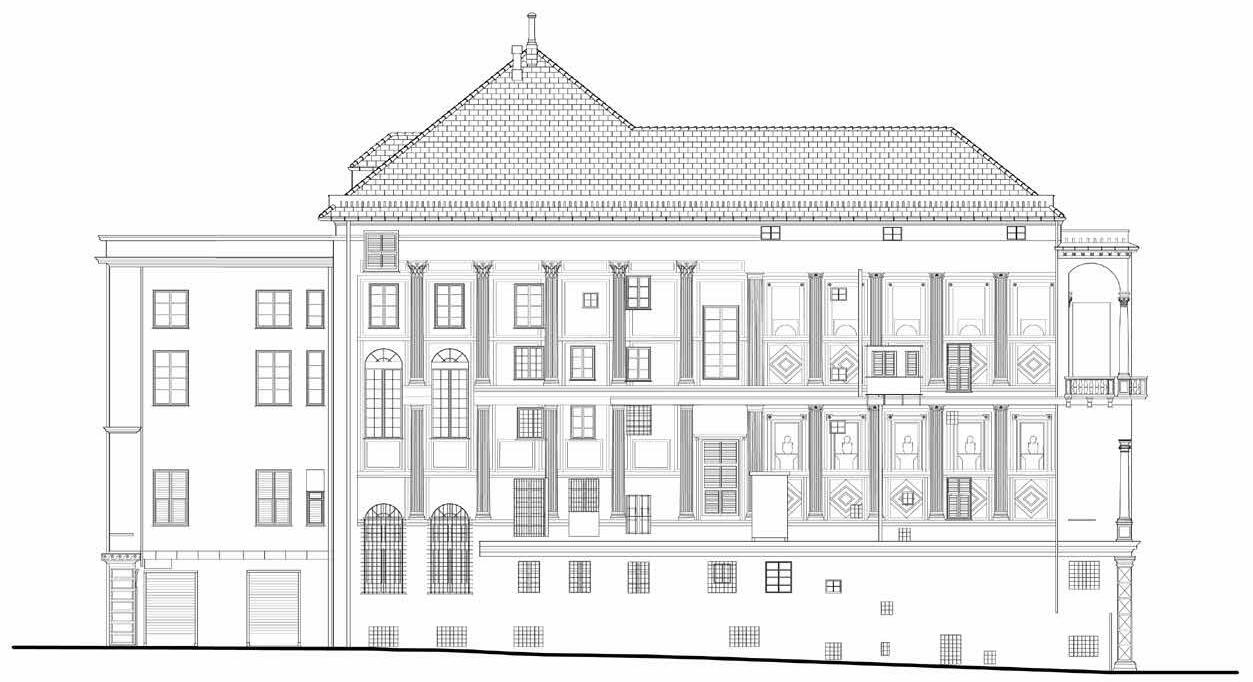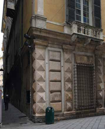 79. Facciata su via del Portello. Dettagli terra-tetto. Stato attuale del fianco. Fotografie dell’Autore, anno 2018 e anno 2021. L’apparato decorativo dipinto della facciata, ad importante apparato architettonico entro cui si susseguono nicchie contenenti grandi figure è tuttora conservato nella sua corrispondenza con l’organismo architettonico: ovvero con le bucature e la scansione dei piani. Ma, lo stato di conservazione della decorazione dipinta è ormai al limite della leggibilità, per pochi brani, e talora trattasi solo di macchie indistinte di colore. Questo fronte ha una facciata totalmente liscia, e in orizzontale presenta la stessa scansione dei piani del fronte principale: piano terreno, con sopra il primo piano nobile, e ancora sopra il secondo piano nobile, quest’ultimo quasi cieco, con due soli finestroni laterali verso piazza Portello. Oltre il basso ammezzato sottotetto, il tetto si rialza nella parte posteriore, quella più importante, dove sono i saloni. Il piano terreno presenta nella parte bassa una serie di porte – nove – corrispondenti agli antichi vani di servizio delle ali laterali, oggi trasformati in negozi aperti su strada, sopra cui sono poche irregolari finestre – quattro – poste in asse con le porte sottostanti, e due piccole finestrelle. Solo un robusto cornicione marcapiano a rilievo, che conclude il piano terreno, scandisce la liscia facciata; su di esso poggia l’apparato dipinto a carattere architettonico, leggibile e conservato solo in parte, al primo piano nobile. Esso consiste in una regolare scansione di lesene scanalate di ordine ionico che reggono una ricca fascia/trabeazione modanata (proseguimento dell ’ordine di facciata del primo piano), entro cui si susseguono le finte nicchie centinate con figure. Di figure se ne conservano oggi solo due, in color finto bronzo dorato, e altre appena adombrate da grandi macchie di colori ormai informi. Sopra le nicchie con cornice modanata la trabeazione è in realtà una fascia continua, anch’essa modanata, sottomessa alle lesene lungo tutta la facciata, a concludere la sequenza delle nicchie, sopra cui si eleva un ulteriore motivo decorativo, un basso pannello rettangolare con cornice a orecchie angolari contrappuntate da una borchia; invece, sopra le poche finestre dalla fascia si alza un motivo dipinto ad arco. L’apparato dipinto era a colori vivaci, con figure a monocromo color bronzo e partitura architettonica di colore chiaro, finto marmo, fondi ed elementi decorativi secondari a colori vivaci che si intravedono appena, con fondi facciata di colore rosso vivo (come le bugne triangolari e le piccole borchie) e sopra riquadrature di fondo di colore grigio.