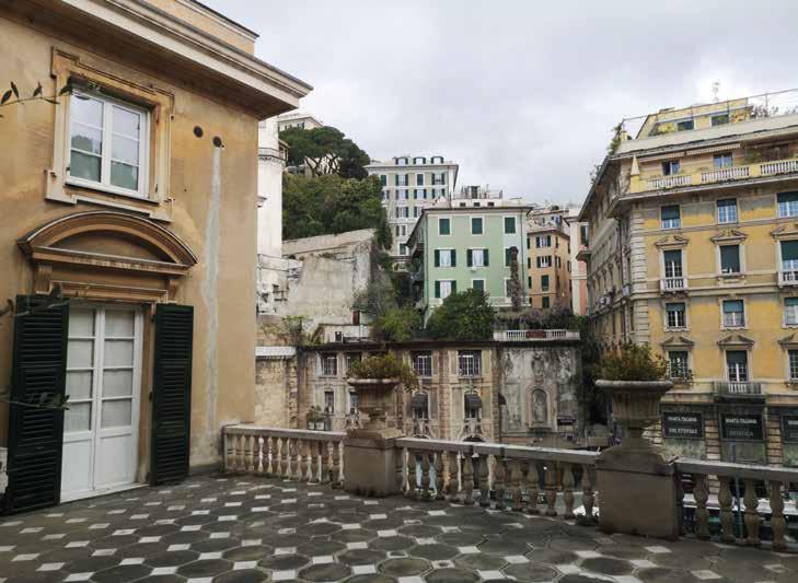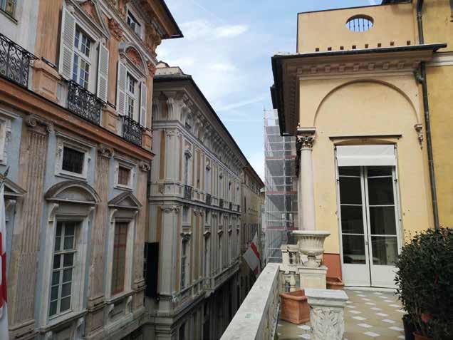 73. Vedute della Strada Nuova dalla terrazza del piano nobile di palazzo Lercari, in alto verso ponente, in basso verso levante e la piazza Fontane Marose, che mostrano la caratteristica di riservatezza di questo palazzo che rientra rispetto agli altri della Strada, ciò che dal basso non si può percepire. Fotografie dell’Autore.