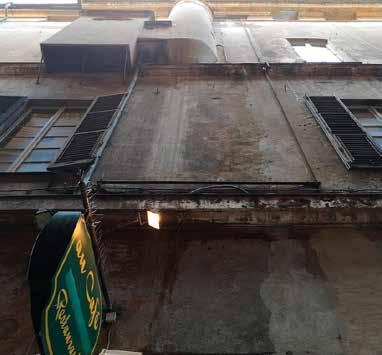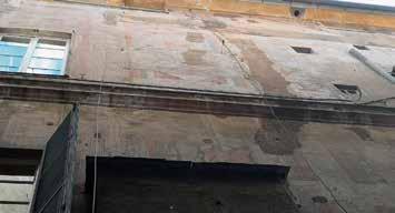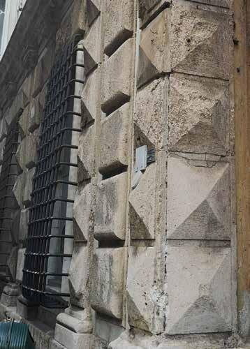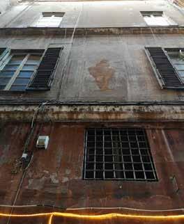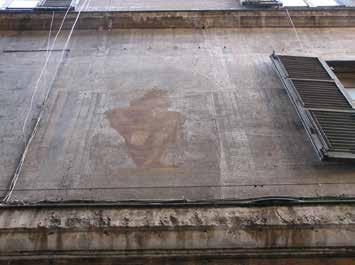 83. Facciata su via del Portello, dettagli di figure e partitura architettonica appena leggibili. Fotografie dell’Autore, anno 2018 e anno 2021.