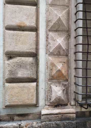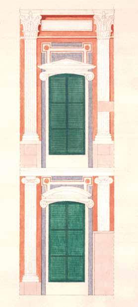 88. Dettaglio in bianco e nero e a colori della fascia decorativa verticale ai due piani nobili (lesene scanalate di ordine ionico e di ordine corinzio) conservate.