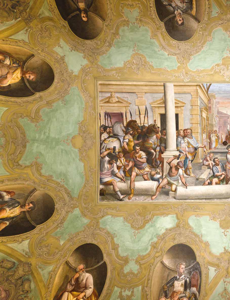 96. L’ordine architettonico dipinto e le campate, con le valenze cromatiche di fondo, ancora leggibili. Fotografie dell’Autore, anno 2021. Sotto dettaglio di una singola campata dell’apparato architettonico dipinto e dei motivi decorativi. Da notare la craquelure avanzata e la fessurazione dell’intonaco. Fotografie dell’Autore, anno 2021.