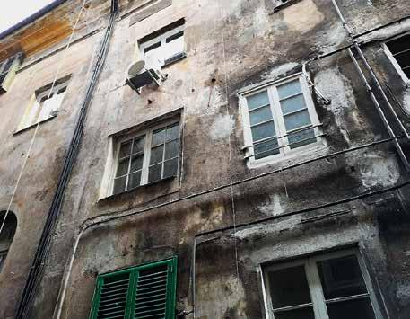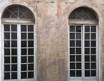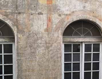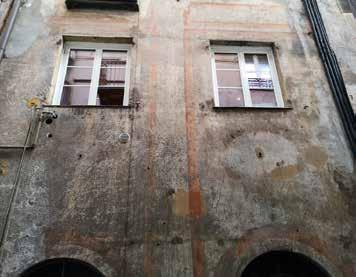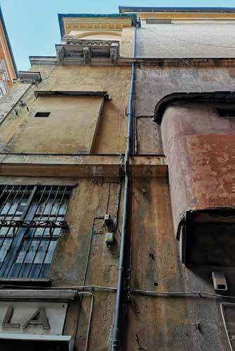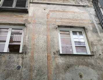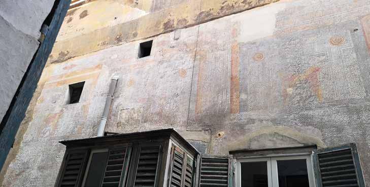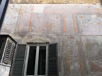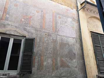 Nella pagina a fronte 94. Parte terminale della facciata verso via Garibaldi. Riconoscibile l’apparato architettonico dipinto, le cornici con borchie e i pannelli dipinti nelle fotografie di assieme e di dettaglio. In basso dettaglio di una singola campata e dei singoli motivi decorativi geometrici. Ancora ben leggibile il disegno dell’architettura dipinta estesa a tutta la facciata, nonostante la craquelure avanzata della pellicola di colore e dell’intonaco stesso. Fotografie dell’Autore, anno 2021.