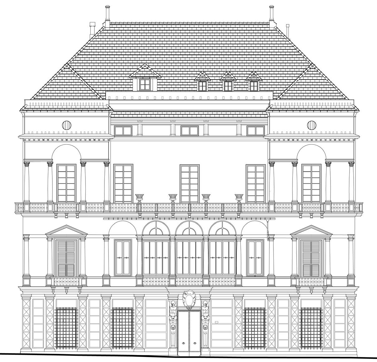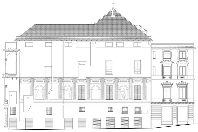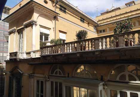 Immagini fotografiche dello stato attuale Il prospetto principale, a logge e terrazzi, caratterizzato da questi spazi aperti che ne traforavano il volume – oltre al grande cortile – con una prevalenza dei vuoti sui pieni, si differenziava già dall’esterno rispetto alla sequenza dei compatti volumi degli altri palazzi. Differenza che per De Negri (1967, p. 137) era «riferita forse a quella ricerca di varietà nell’unità che si riscontrano nelle prospettive di strade disegnate da Francesco di Giorgio Martini, o nelle scenografie dello Scamozzi» (vedasi fig. 1 in questo volume); dimostrazione dell’aggiornamento culturale degli architetti che operano a Genova. Compositivamente, il prospetto è incardinato su un deciso asse di simmetria, cui si relazionano i pieni e i vuoti; esso è ritmato da cinque assi finestra, tutti coassiali, ed è