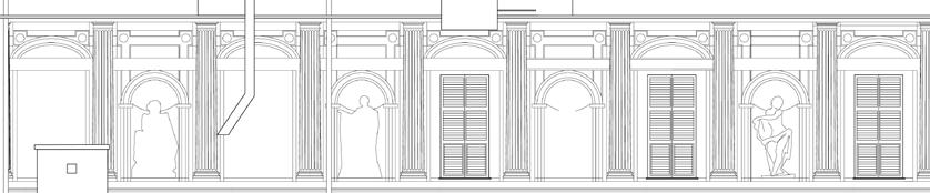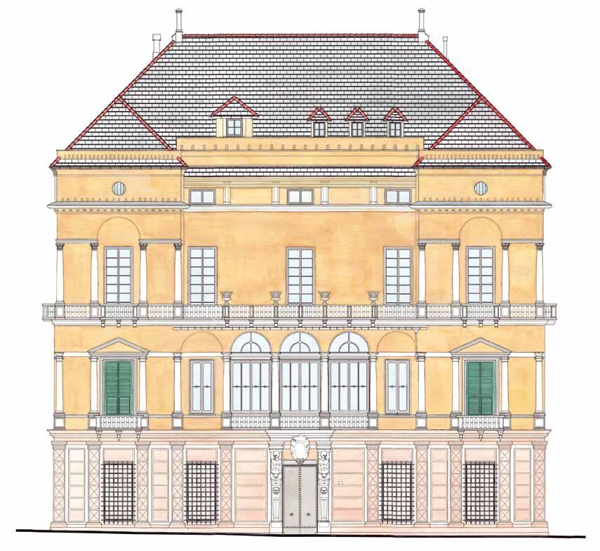 Rilievo e restituzione grafica dell’apparato architettonico, decorativo e cromatico del prospetto principale La rappresentazione del fronte, assai precisa, in bianco e nero, restituisce tutti i caratteri dimensionali, proporzionali, compositivi, decorativi e costruttivi, ma non rende al completo le caratteristiche materiche, cromatiche e decorative dell’edificio e del suo fronte. La restituzione di tali componenti cromatiche (fig. 78) avvicina invece alla percezione reale, con al piano terreno le tonalità chiare – oggi scurite e consumate dal tempo – della pietra di Finale, l’apparato architettonico-decorativo dell’intera facciata in marmo bianco, e la tinteggiatura ocra-giallino chiaro/terra d’ombra chiaro del piano di fondo del primo, secondo piano e dell’ammezzato. Il colore azzurro-grigio delle vetrate restituisce poi l’effetto di trasparenza di tali superfici così come appare alla percezione.