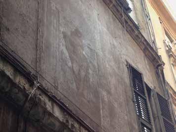 81. Facciata su via del Portello, dettaglio dell’affresco di figura in nicchia ancora conservato. Fotografie dell’Autore, anno 2018 e anno 2021.