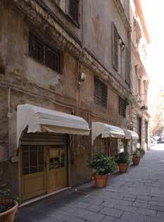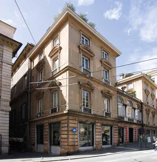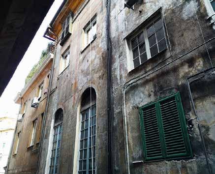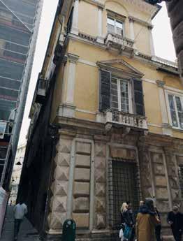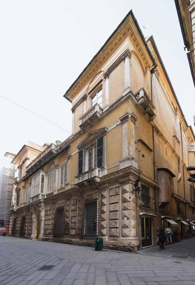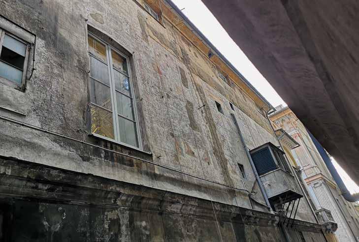scanalate, ioniche al primo piano e corinzie al secondo (la facciata su via del Portello conserva però la decorazione dipinta solo al primo piano), salvo la diversa risoluzione di quanto rappresentato tra le lesene: nella facciata su via del Portello nicchie con figure, nell’altra su via Antonio Brignole Sale elementi geometrici – triangoli e rombi – e busti su piedestalli. Non si conoscono gli autori di queste decorazioni affrescate ma certo si tratta di maestranze aggiornate in questa tecnica e sui tipi decorativi di quanto si produceva a Genova a metà Cinquecento. Riguardo alla datazione si può ipotizzare contemporanea alla costruzione, o di poco successiva, in quanto l’apparato architettonico dipinto riprende quello plastico, della facciata su via Garibaldi. La lettura ancora più puntuale e ravvicinata delle due facciate, le ricognizioni visive, le fotografie, dal 1978 sino a quelle attuali, e i rilievi recenti, fanno leggere più in dettaglio le caratteristiche – tipologia decorativa ed elementi – ma anche lo stato di conservazione, purtroppo assai immiserito e svilito, non solo dalla consunzione delle superfici pittoriche, e dal degrado dell’intonaco di supporto, ma anche dallo stato generale di degrado delle murature, e da quello derivante dagli impianti incongrui a vista, dall’apposizione di tende, insegne e quanto legato all’uso commerciale, soprattutto al piano terreno, senza tener conto della importanza e delicatezza di queste superfici.