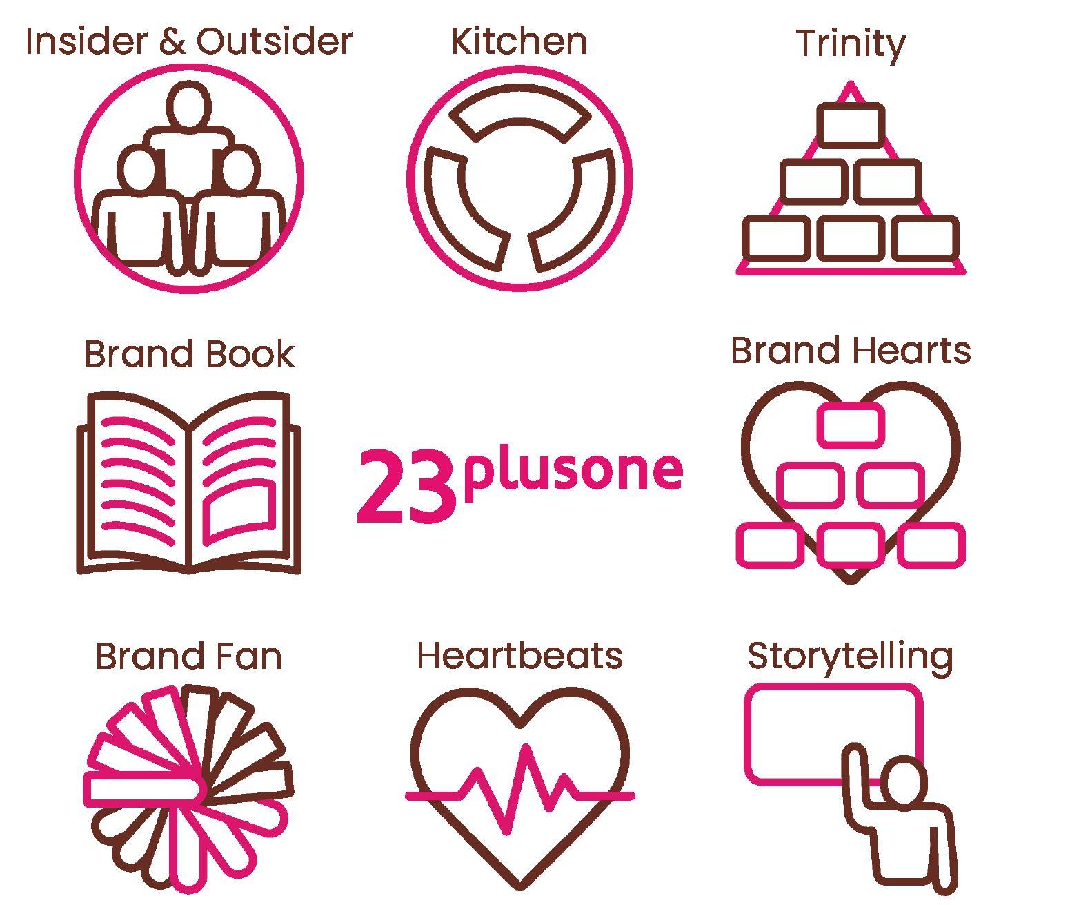 Webringavarietyofservicesandtoolsforeveryjob.Withthe scientific23plusonemethodatthecoreofourapproach,we alwaysprioritisepeople'semotionaldrives.Afterall,webelieve thatthepeoplearethebrand.Usingthesetoolswe,as human-centreddesigners,provideintegratedstrategy,culture andexpressionservices.