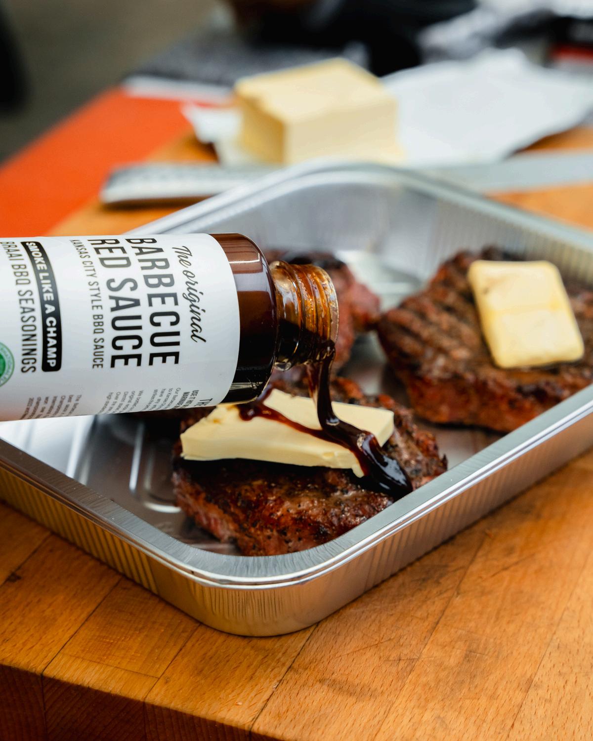 In de verpakking doe je een genereuze portie boter, Barbecue Red Sauce en een scheutje appelsap. Keep it simple.