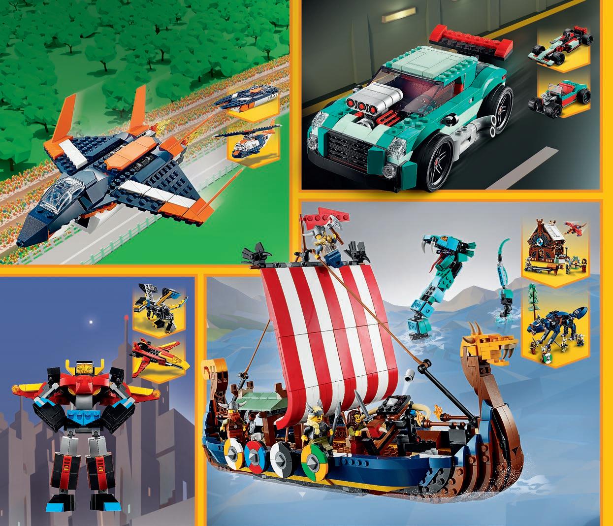 31126 Überschalljet L’avion supersonique 7+ Jahre / ans 31127 Strassenflitzer Le bolide de rue 7+ Jahre / ans 31132 Wikingerschiff mit Midgardschlange Le bateau viking et le serpent de Midgard 9+ Jahre / ans 31124 Super-Mech Le Super Robot 6+ Jahre / ans
