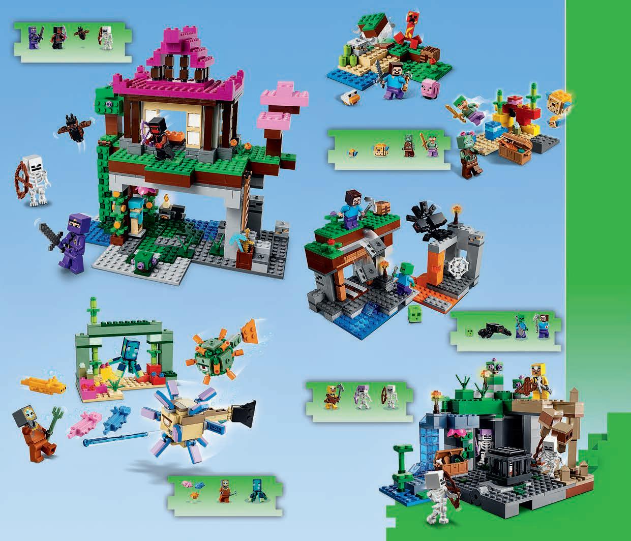 79 LEGO ® MINECRAFT ® LEGO.com/minecraft 21180 Das Wächterduell Le combat des gardiens 8+ Jahre / ans 21183 Das Trainingsgelände Le camp d’entraînement 8+ Jahre / ans 21177 Der Hinterhalt des Creeper™ L’embuscade du Creeper™ 7+ Jahre / ans 21189 Das Skelettverlies Le donjon du squelette 8+ Jahre / ans 21166 Die verlassene Mine La mine abandonnée 7+ Jahre / ans 21164 Das Korallenriff Le récif corallien 7+ Jahre / ans Download 3D CATALOGUE SMALL SLIME SPIDER ZOMBIE STEVE 3X AXOLOTL DIVER GLOW SQUID CAVE EXPLORER SKELETON 2X SKELETON ROGUE NINJA BAT SKELETON PUFFERFISH PUFFERFISH DROWNED ALEX