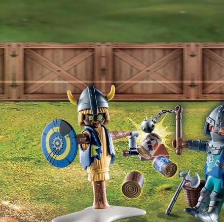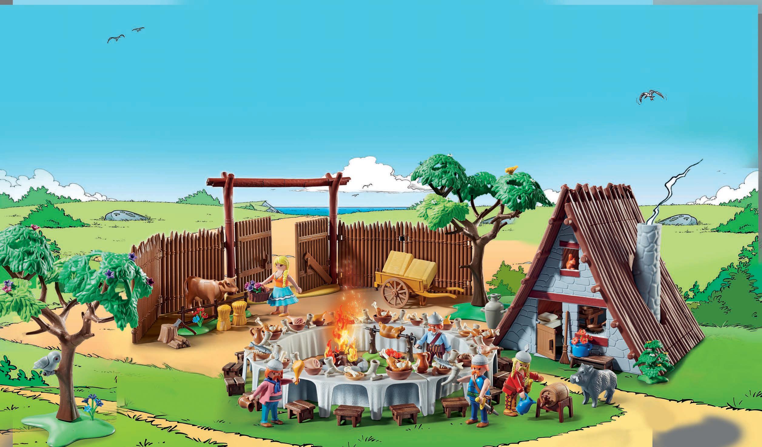 70931Astérix Le banquet du village. Avec un tournebroche et un feu central. Le toit de la hutte peut être retiré pour jouer à l’intérieur. 18 Gaulois peuvent s’asseoir autour de la table du banquet.
