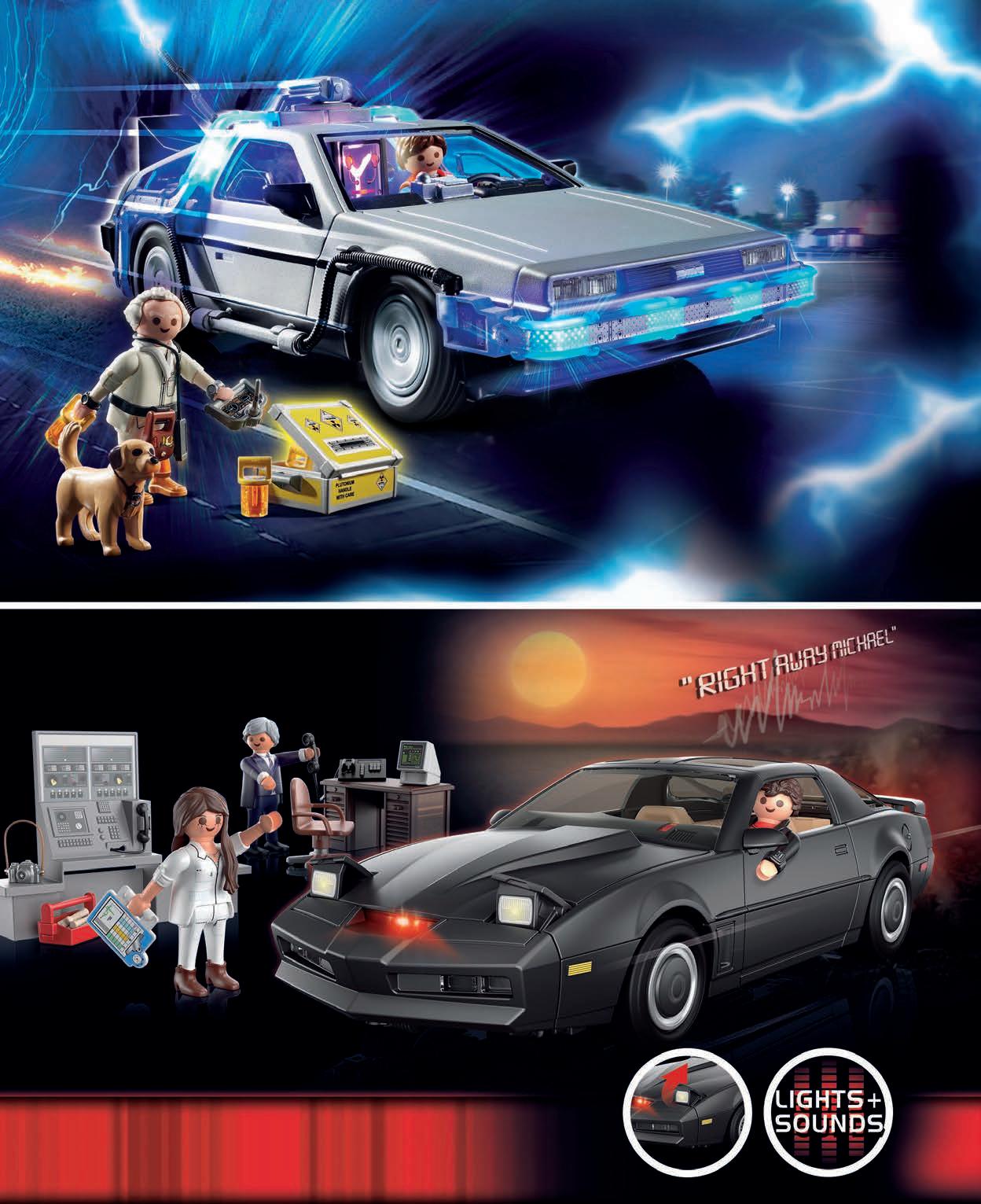 70317Back to the Future DeLorean. Marty McFly et le Doc avec des tenues de 1985. Avec convecteur temporel au plutonium, skateboard, télécommande et le chien Einstein. Longueur du véhicule : 25 cm.