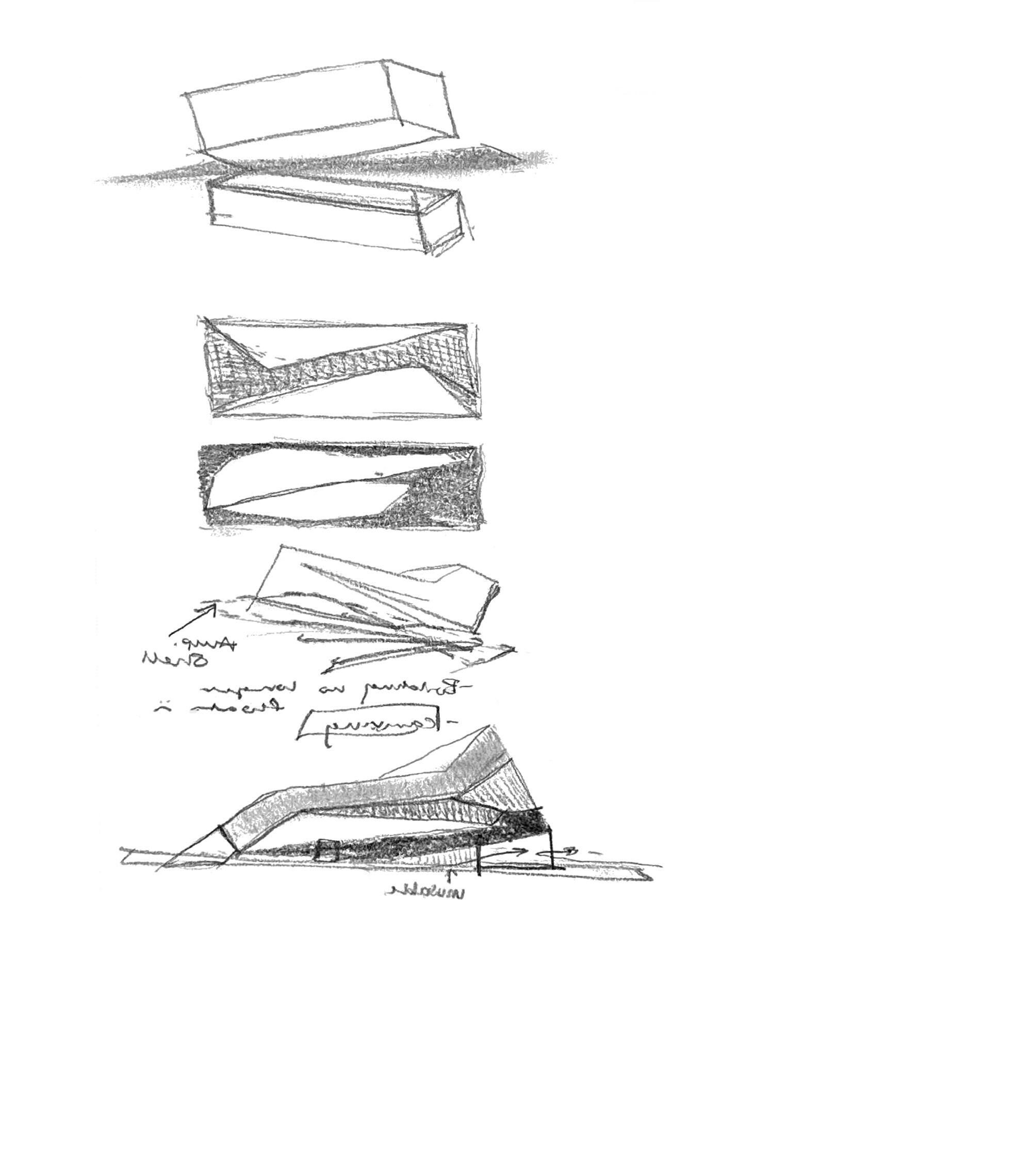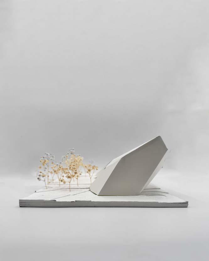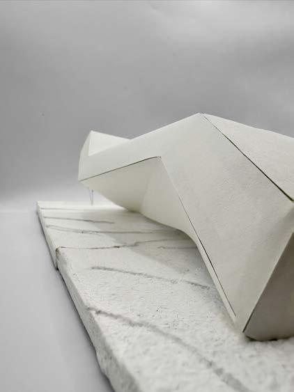 Given the simple geometry of these massing models, the ground condition quickly became the most important concept in this project. Not only does this building touch ground, it fractures it, creating an amphitheater by extending the geometries of a carved section and an overhang awning through a cantilevering arm.