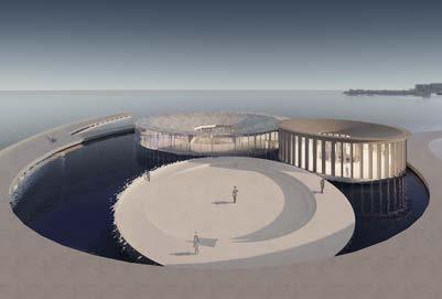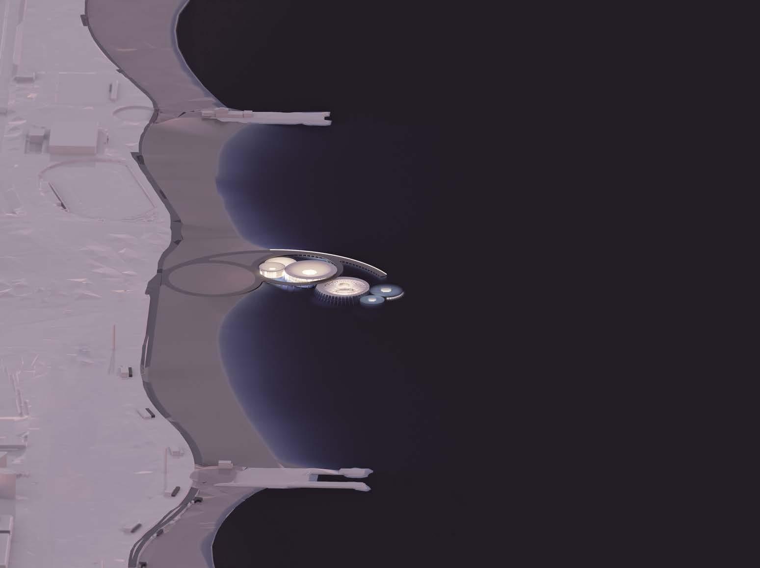 for prefabrication and sinking the fully constructed masses during construction. Buildings 5 and 6 are the only fully submerged spaces, experiencing the most dramatic