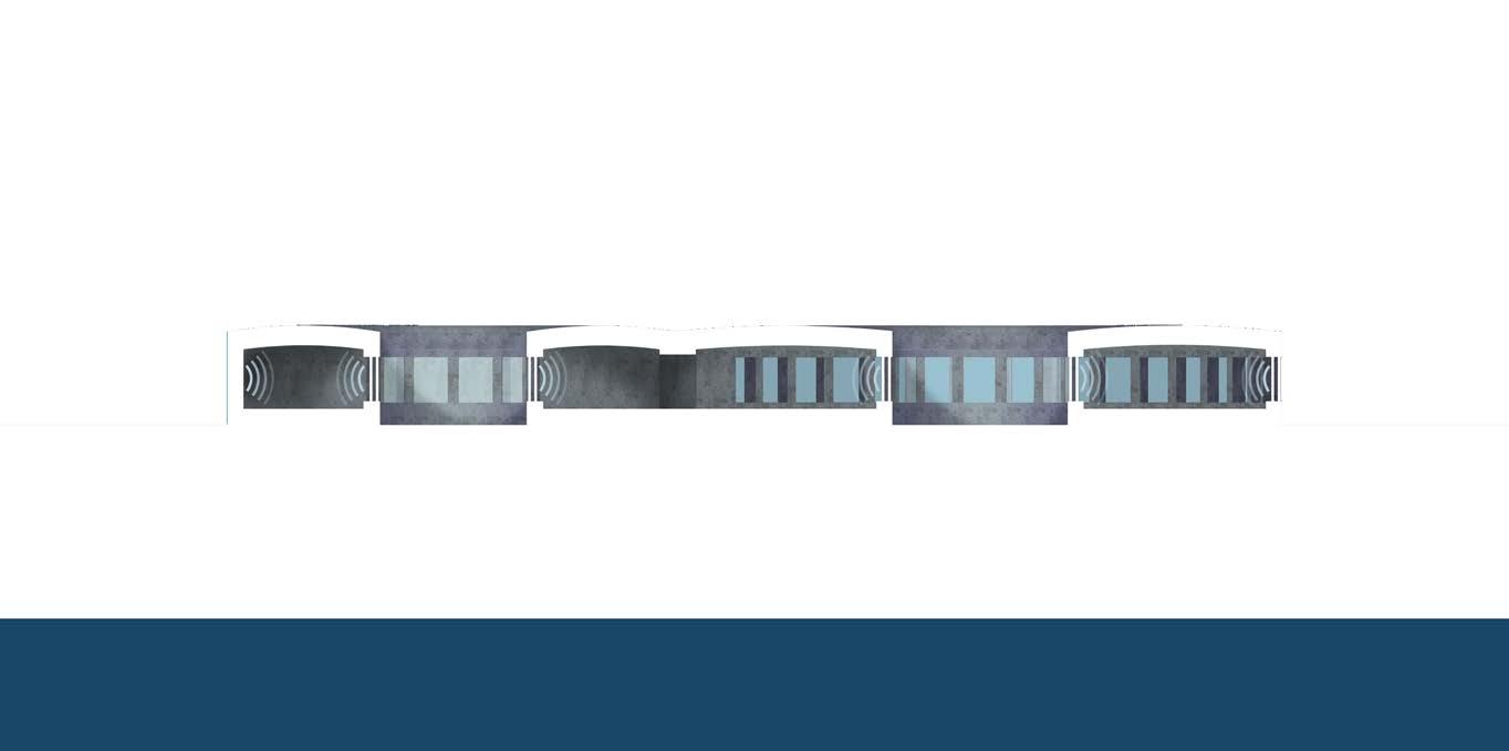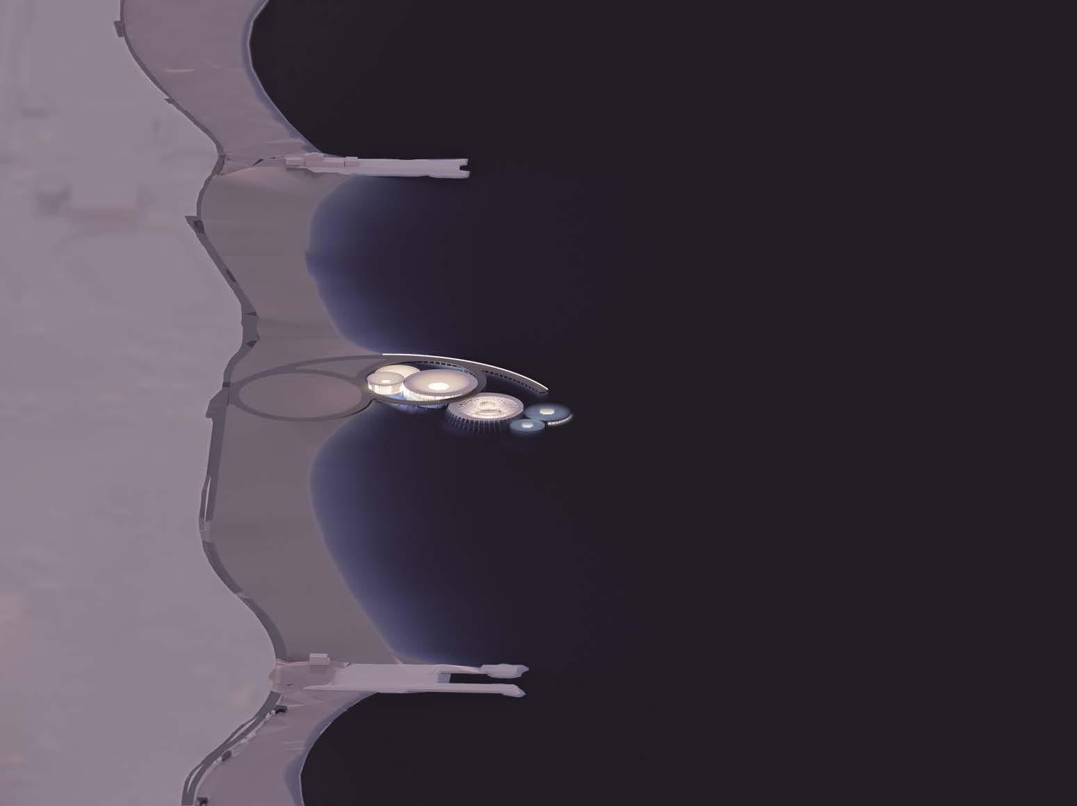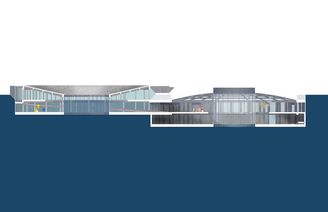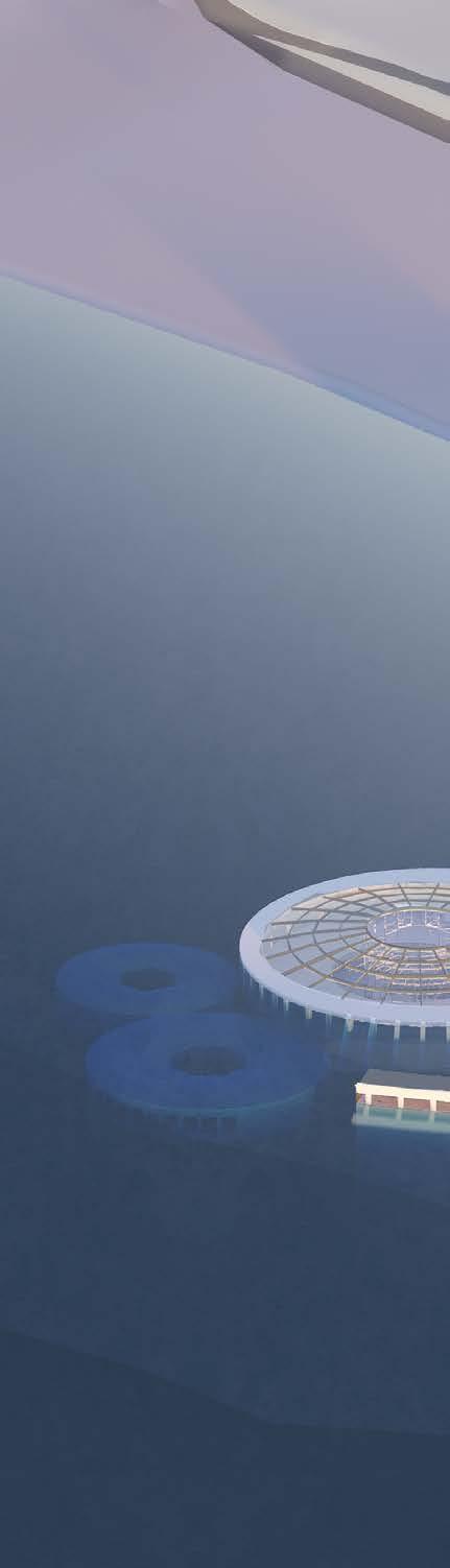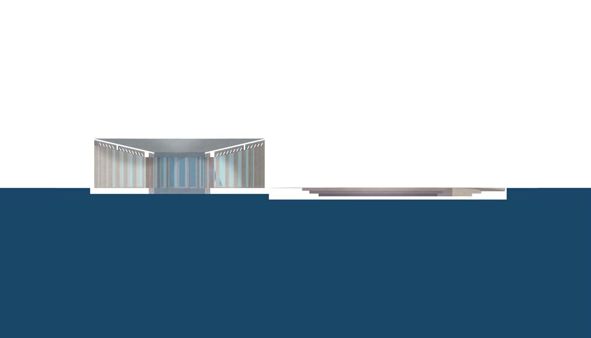 dome exerts outward forces on the roof collar, counteracting the inward push of water. B3 is the first sunken building and begins to experience the conditions of being within the sea and sky: water and pools for filtering and reflecting light, thermal buffering from the sea, and the ambiance of the sea in the lulling of currents on the exterior walls.