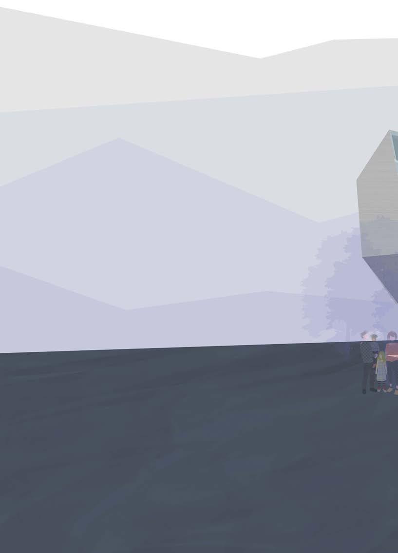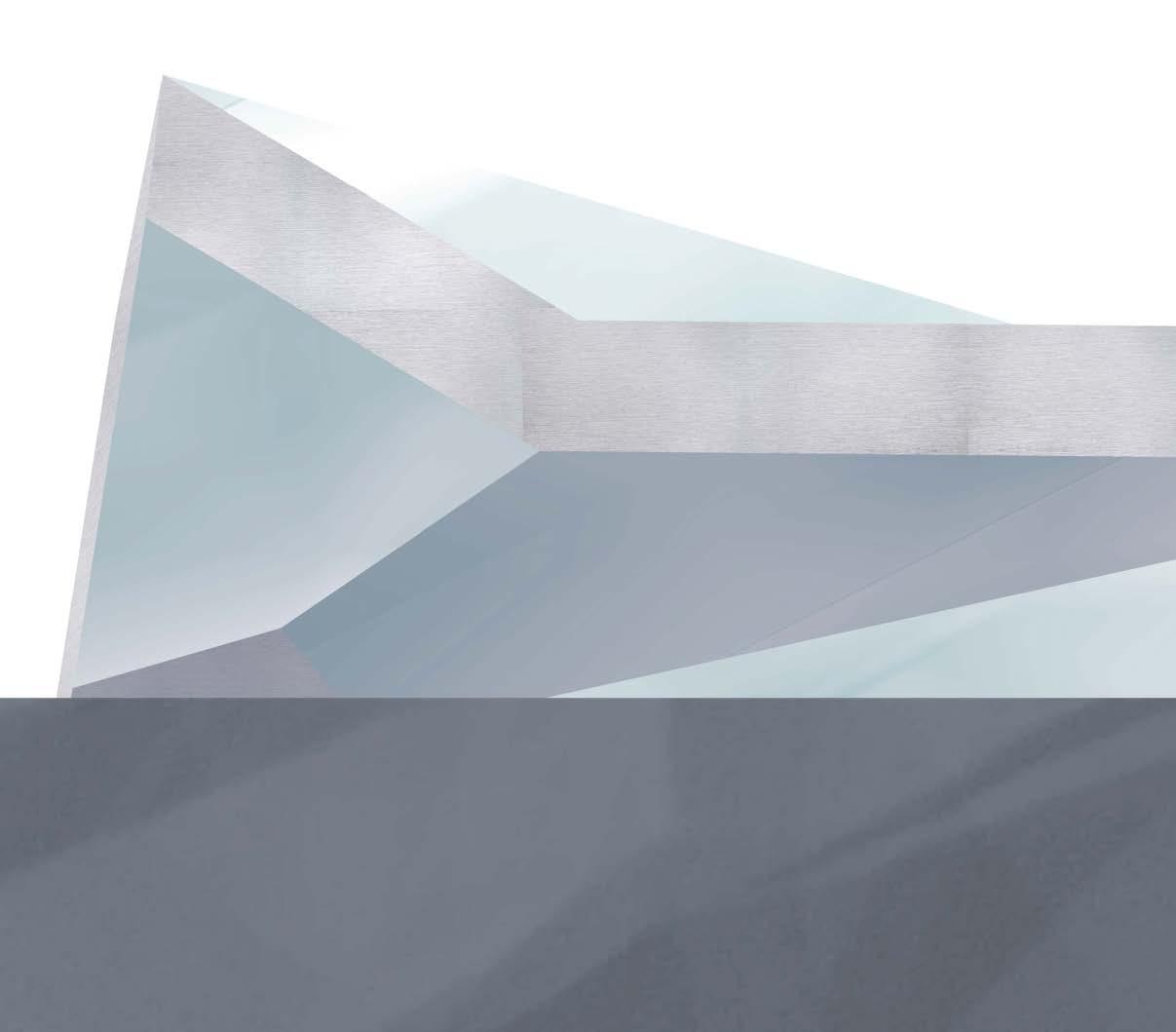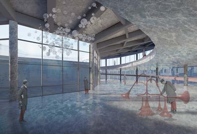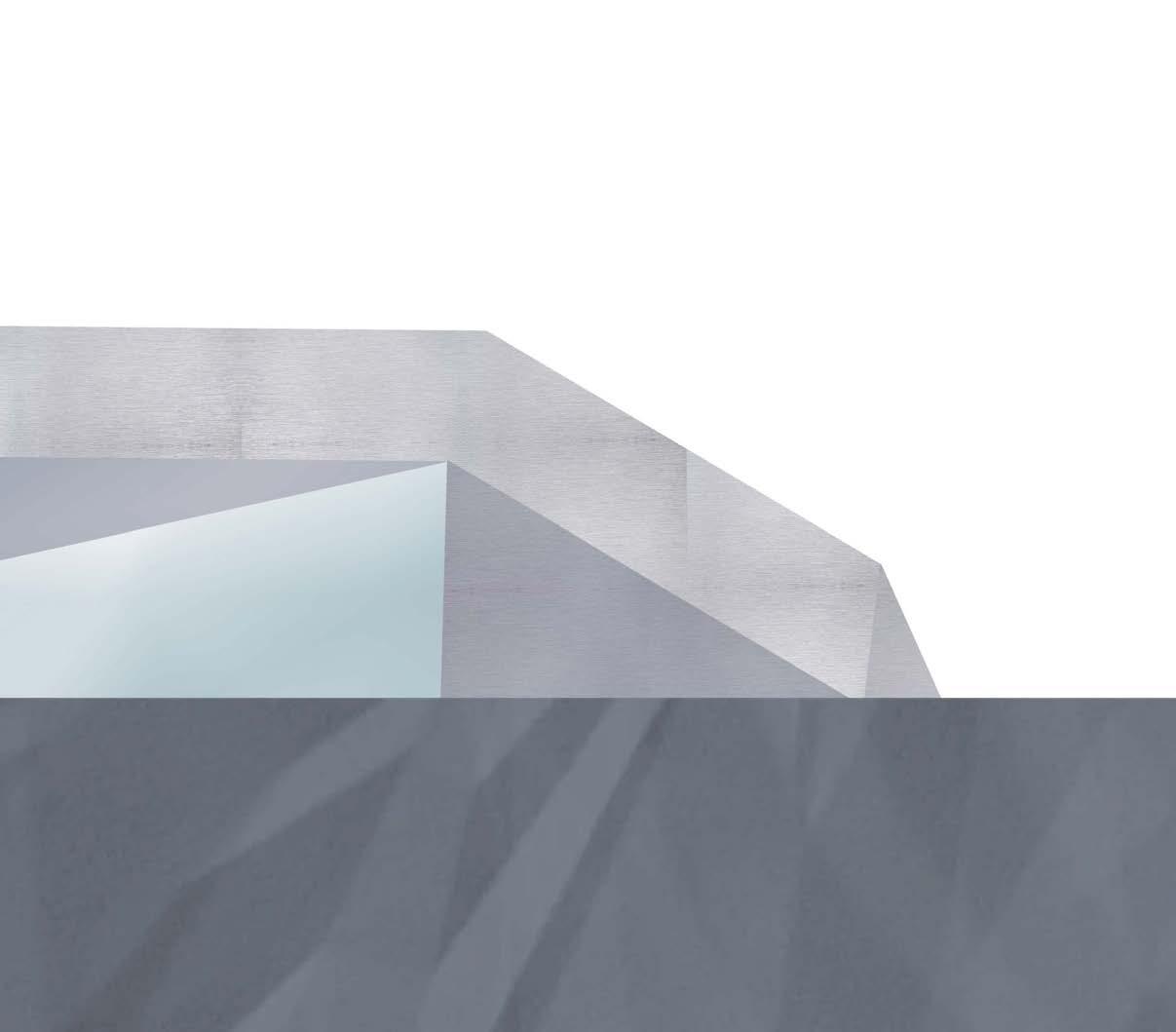 By the very nature of this design—a carved rectangular prism—a heavy horizontal language emerged. The weight of the ground-embedded form is juxtaposed against a lighterthan-air cantilever, offering balance to an otherwise heavy structure. The section cut emphasizes the horizontal nature with the floor plans highlighting the carved shape of the building, dipping into subtracted space and launching off of raised areas. Floor designs were created with artist needs in mind: practice rooms feature nonparallel geometries to eliminate standing waves and increase sound quality.