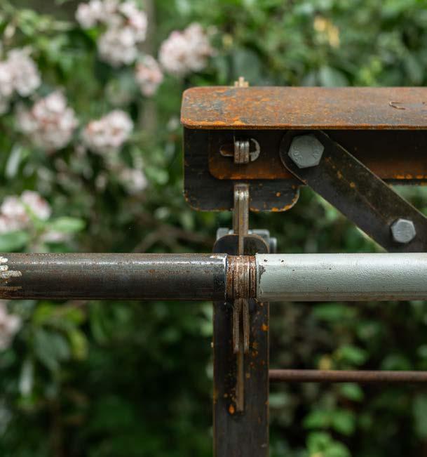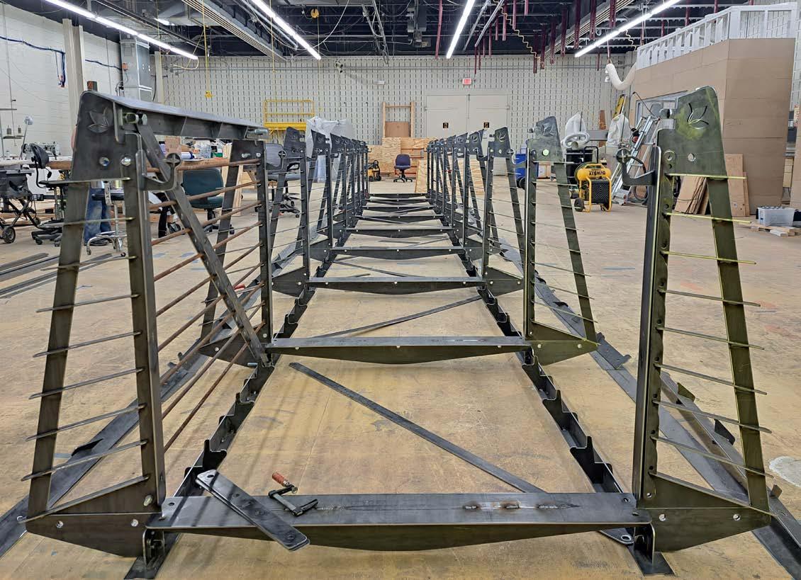 We began dry fitting and welding in an off-site construction lab before splitting the bridge in two halves, bringing it to the site by truck, and moving it into position atop a series of scaffolding and concrete foundations.